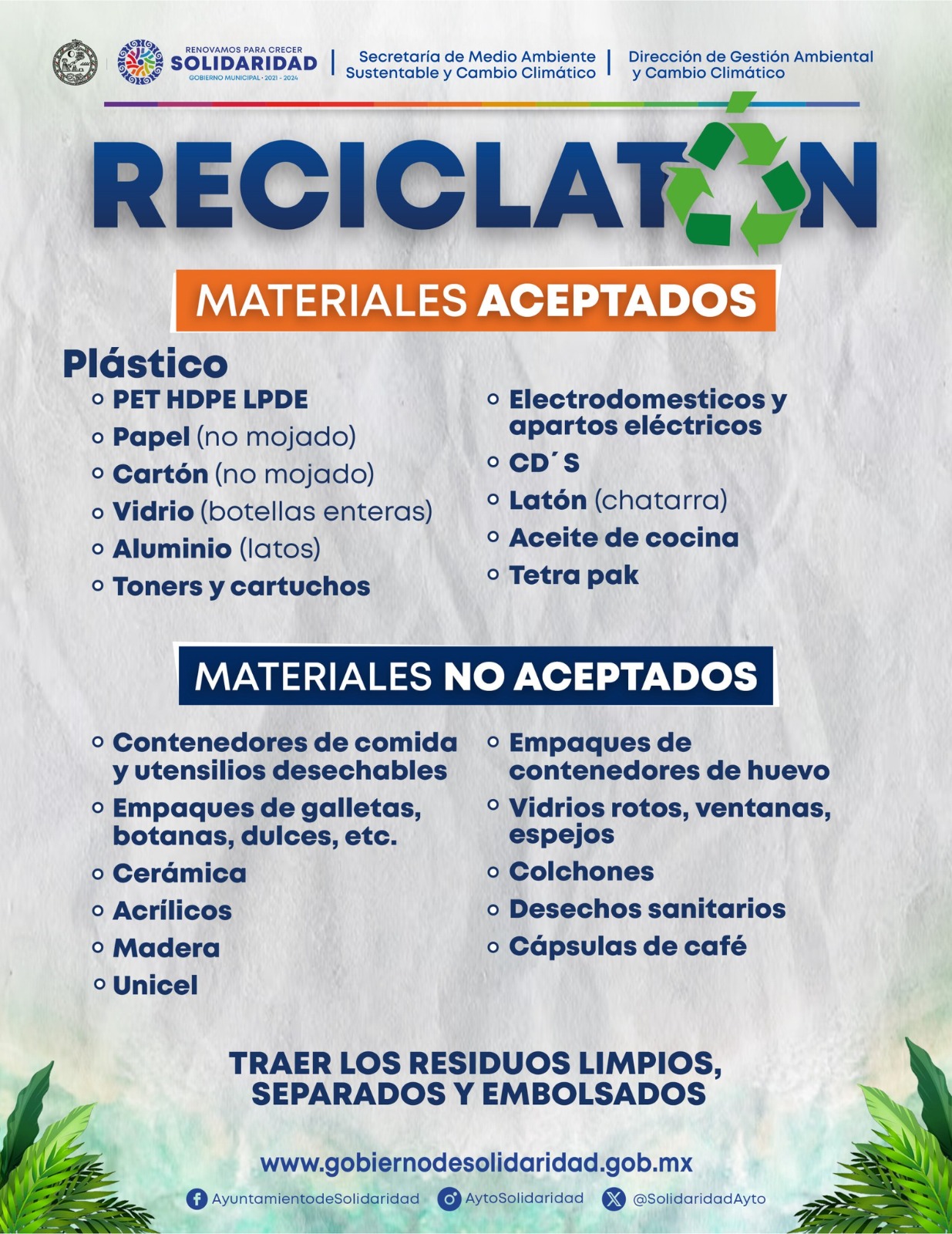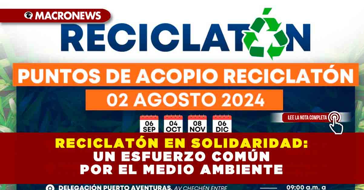 Playa del Carmen, Solidaridad a 01 de agosto del 2024.- Se invita a la ciudadanía en general a participar en el programa «Reciclatón» que se llevará a cabo el próximo viernes 2 de agosto. Este esfuerzo ambiental que realiza el Ayuntamiento de Solidaridad dirigido por la presidenta municipal Lili Campos, promueve la cultura del reciclaje y la correcta disposición de residuos sólidos en el municipio.