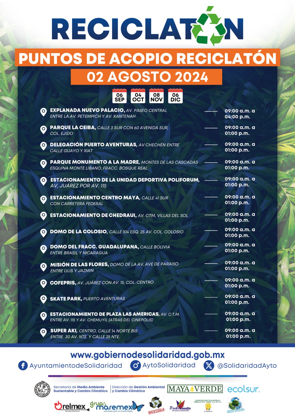 El Reciclatón cuenta con 14 puntos de acopio estratégicamente distribuidos en diversas áreas del municipio, incluyendo Puerto Aventuras. Los centros de acopio estarán operativos desde las 9 de la mañana hasta la 1 de la tarde, a excepción de la Plaza 28 de Julio, que extiende su horario hasta las 4 de la tarde. Además, se cuenta con un punto fijo ubicado a un costado del estacionamiento de la Secretaría de Servicios Públicos en Villamar 1, disponible de lunes a viernes de 9 a 4 de la tarde y sábados de 9 a 1 de la tarde.