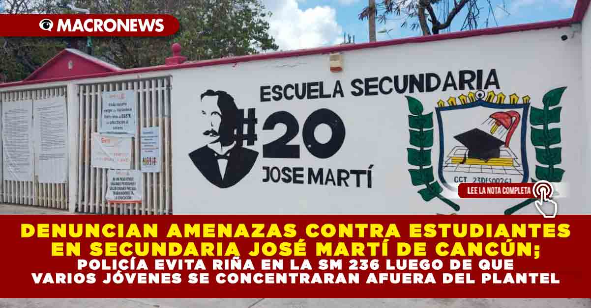 Redacción Macronews.- Padres de familia de la secundaria general José Martí, ubicada en la Supermanzana 236 de Cancún, solicitaron la intervención de la policía la tarde de este jueves, luego de que varios jóvenes se concentraran a las afueras del plantel con la intención de agredir a estudiantes. La situación generó alarma entre la comunidad escolar, pues se temía un enfrentamiento campal.