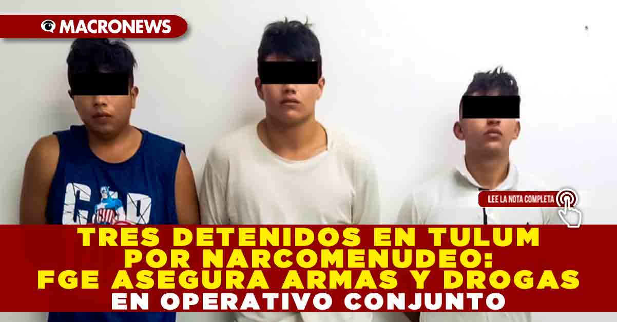 Redacción Macronews.- La Fiscalía General del Estado de Quintana Roo (FGE), en coordinación con la Policía Municipal de Tulum, informó la detención en flagrancia de tres masculinos por su presunta relación con el delito contra la salud en su modalidad de narcomenudeo. Los asegurados fueron identificados como Rosendo Julián “N”, Kevin Miguel “N” y José Alejandro “N”, quienes fueron sorprendidos sobre la carretera Tulum-Boca Paila, a la altura del kilómetro 5.9, mientras realizaban un intercambio de posibles estupefacientes.