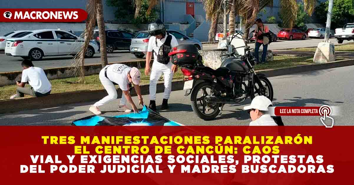 Cancún.- La mañana de hoy, el corazón de Cancún se vio inmerso en un caos vial debido a tres manifestaciones simultáneas, provocando un impacto significativo en la movilidad de la ciudad. Dos de estas movilizaciones fueron protagonizadas por madres buscadoras, mientras que la tercera tuvo lugar en la icónica glorieta del Ceviche, donde colaboradores del Poder Judicial de la Federación alzaron la voz.