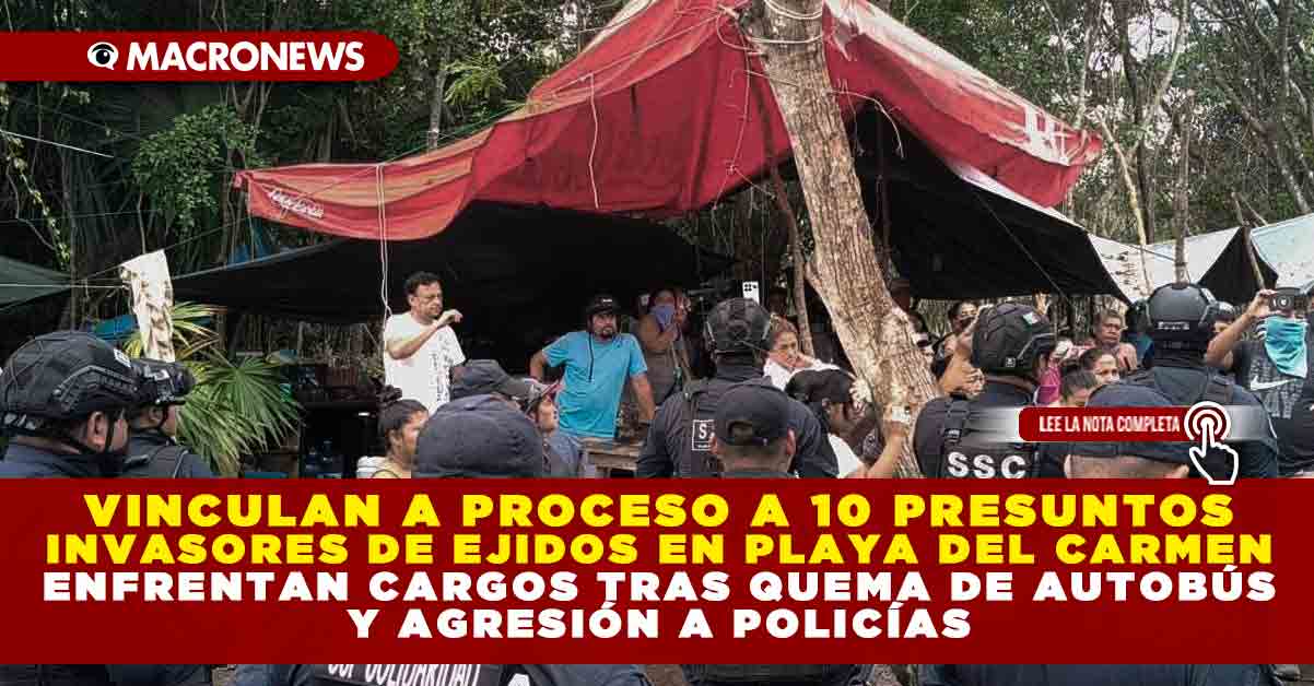 Redacción Macronews.- Diez personas fueron vinculadas a proceso por su presunta participación en la invasión de terrenos ejidales en Playa del Carmen, hechos ocurridos el pasado 7 de octubre al final de la avenida Juárez, zona que ha registrado múltiples conflictos por ocupaciones ilegales. Durante el operativo de desalojo, los detenidos habrían agredido a elementos policiales con machetes y provocado la quema de un autobús de la corporación municipal.