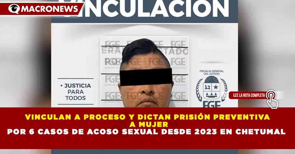Redacción Macronews.- Una mujer identificada como María Candelaria “N” fue vinculada a proceso y permanecerá en prisión preventiva, tras ser señalada por su presunta responsabilidad en al menos seis hechos de acoso sexual cometidos desde agosto de 2023 en la ciudad de Chetumal, informó la Fiscalía General del Estado de Quintana Roo.
