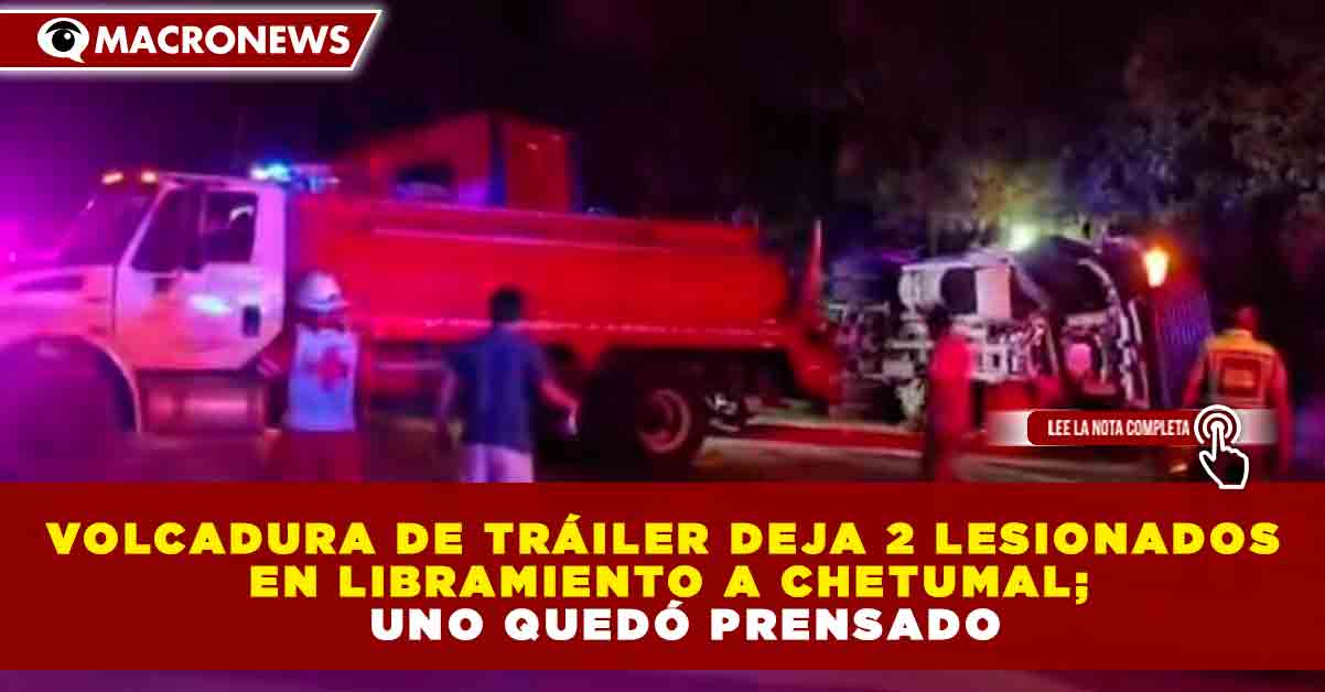 Redacción Macronews.- Un aparatoso accidente se registró la noche del sábado 7 de febrero en el libramiento de salida a Chetumal, a la altura del municipio de Felipe Carrillo Puerto, donde un tráiler volcó y terminó incrustado entre la maleza, dejando como saldo dos personas lesionadas, una de ellas atrapada dentro de la cabina.