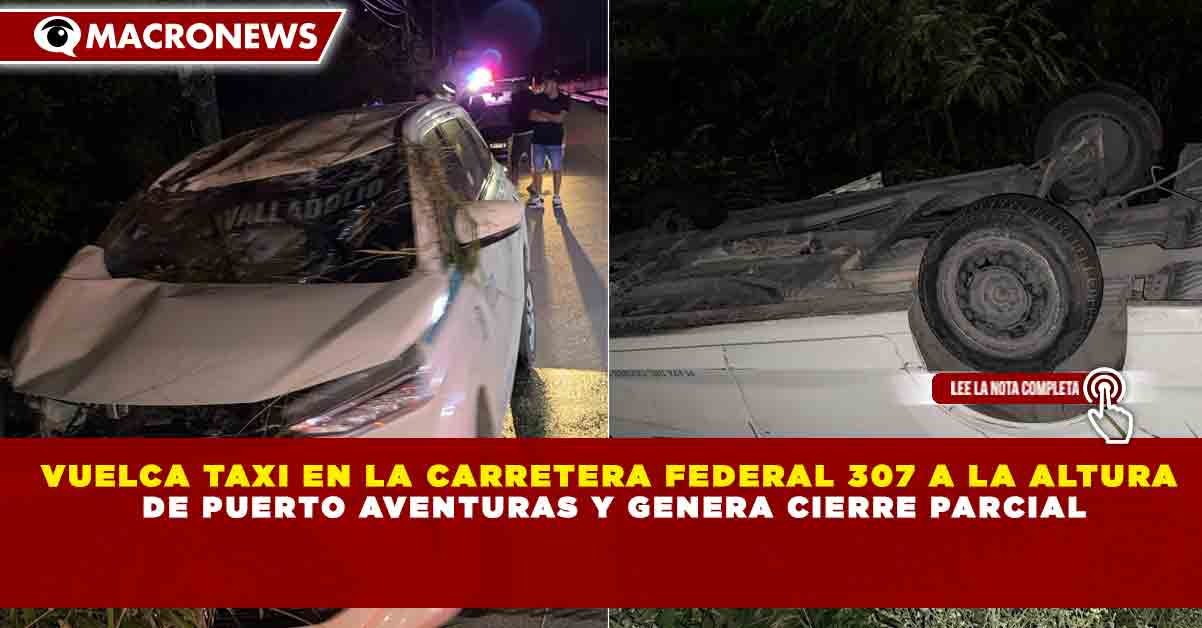 Un taxi volcó la mañana de este miércoles sobre la carretera federal 307, a la altura de Puerto Aventuras, hecho que provocó la movilización de cuerpos de emergencia y autoridades viales, además de afectaciones momentáneas a la circulación en este tramo carretero.