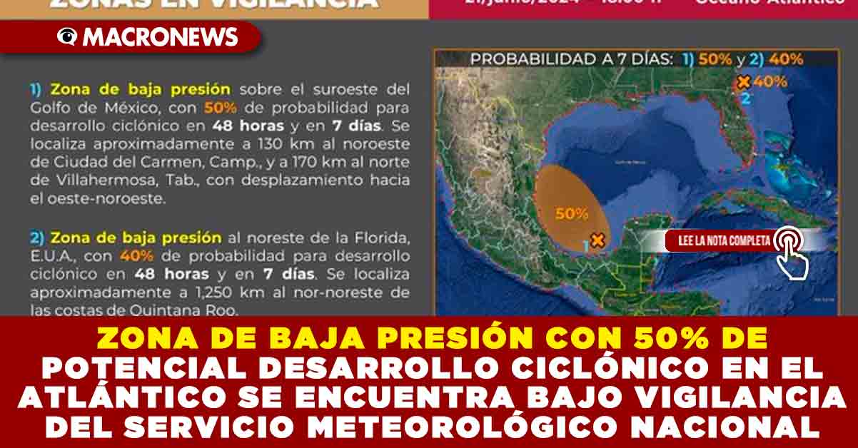 ⚠️ El #SMNmx mantiene la vigilancia en dos zonas de #BajaPresión con potencial para desarrollo ciclónico en el #Atlántico. Todos los detalles en el gráfico pic.twitter.com/UkrSsf0Hhk