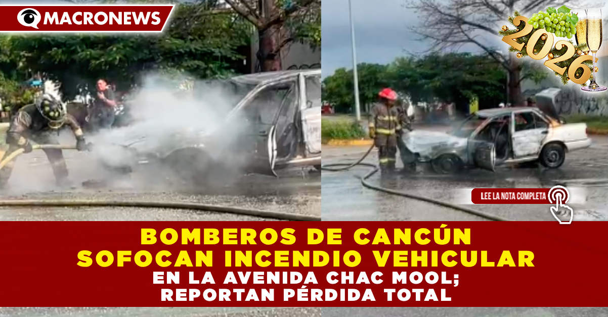 CANCÚN, Q. ROO. – Elementos del Heroico Cuerpo de Bomberos de Cancún atendieron de manera oportuna el incendio de un automóvil la mañana de este lunes 12 de enero, registrado en el cruce de las avenidas Chac Mool y Jacinto Canek, a la altura de la Supermanzana 223.