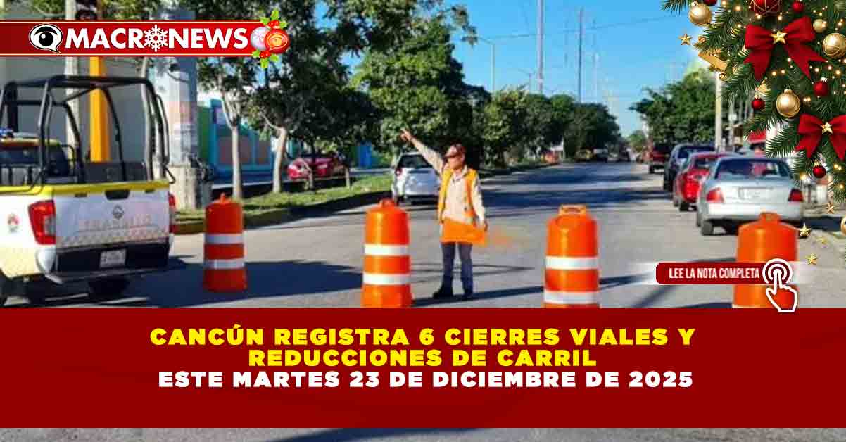 Redacción Macronews.- A pesar del periodo vacacional estudiantil, este martes 23 de diciembre se mantienen afectaciones viales en Cancún, con al menos 6 cierres y confinamientos parciales en arterias clave, derivadas principalmente de las obras del Puente Nichupté y trabajos de mantenimiento urbano, lo que genera tránsito lento en distintos puntos de la ciudad.