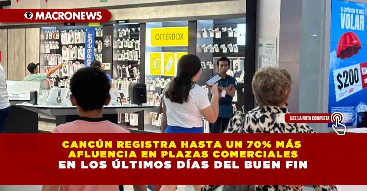 CANCÚN, QRoo, 16 de noviembre de 2025.- Diversas plazas y establecimientos de Cancún registraron una alta afluencia de visitantes durante el penúltimo día del Buen Fin, donde tanto compradores como familias acudieron para aprovechar descuentos o simplemente pasear. Desde antes del mediodía, plazas como Las Américas concentraron a gran parte del flujo, especialmente en tiendas departamentales que ofrecieron promociones que incentivaron las compras. El movimiento se mantuvo constante hasta las nueve de la noche, cuando la mayoría de los comercios cerraron actividades.Leer: ESTUDIANTES DE LA UT DE CANCÚN PODRÁN REALIZAR ESTADÍAS PROFESIONALES EN EMBAJADAS DE TODO EL MUNDO