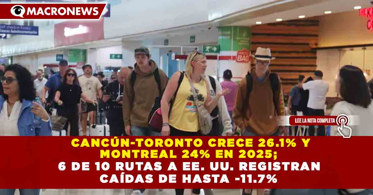 De acuerdo con los datos del sector, la ruta Cancún-Toronto creció 26.1% y Cancún-Montreal 24%, cifras que compensan parcialmente la disminución en rutas clave desde Estados Unidos.