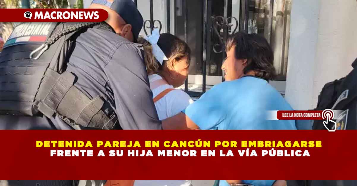 Redacción Macronews Cancún, Quintana Roo — Autoridades detuvieron a una pareja acusada de consumir bebidas alcohólicas en la vía pública frente a su hija menor de edad. El hecho ocurrió en la Región 235 de Cancún, cuando los oficiales realizaban un recorrido de vigilancia y observaron a los adultos ingiriendo alcohol frente a la menor.
