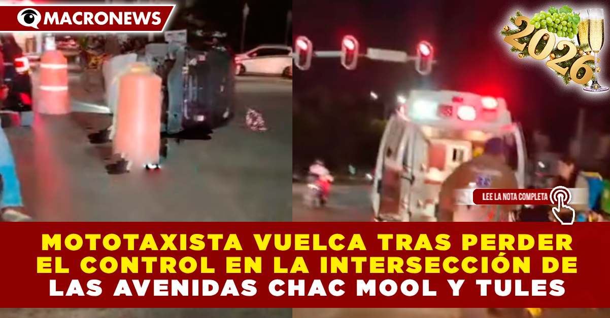 CANCÚN, Q. ROO. – Un aparatoso accidente de tránsito se registró la noche de este 15 de enero en las inmediaciones de la Región 248, cuando una unidad de mototaxi terminó volcada sobre su costado tras una mala maniobra de su conductor en el cruce de las avenidas Chac Mool y Los Tules.
