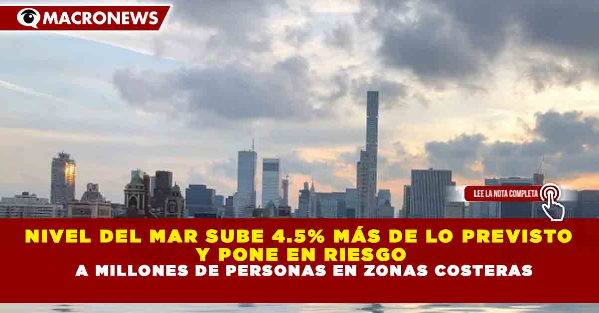 Redacción Macronews.- Nuevos estudios indican que el nivel del mar ha aumentado un 4.5% más de lo proyectado para 2026, lo que representa un riesgo creciente para millones de habitantes de zonas costeras en todo el mundo. Científicos alertan que esta aceleración está vinculada al derretimiento más rápido de glaciares y al efecto combinado del calentamiento global.