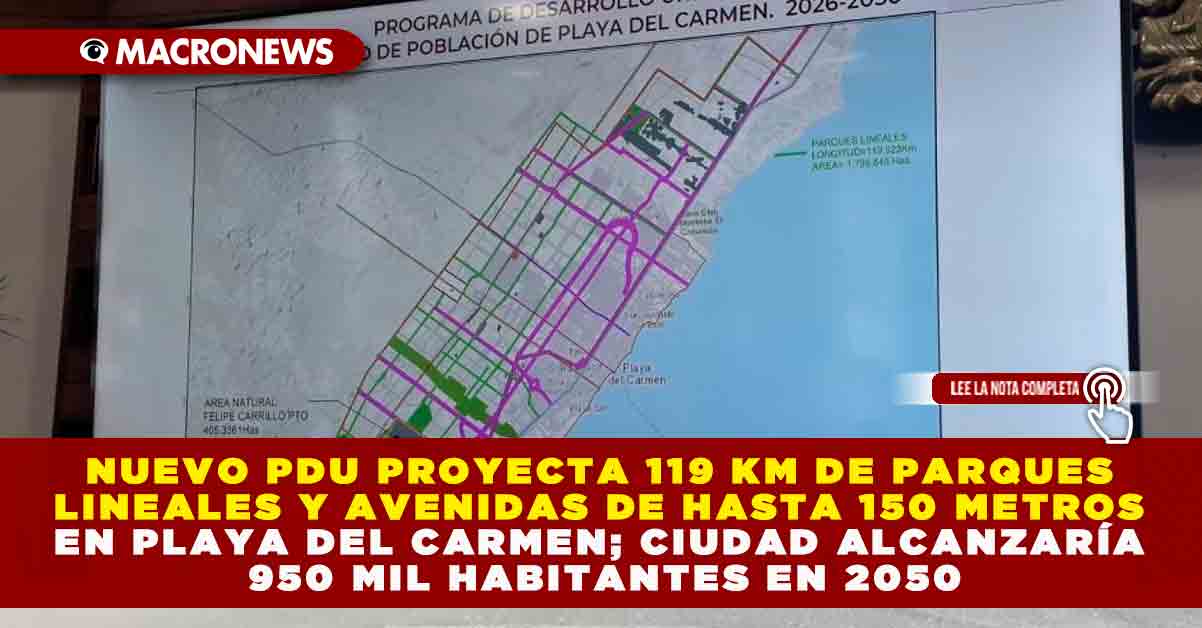 Nuevo PDU proyecta 119 km de parques lineales y avenidas de hasta 150 metros en Playa del Carmen; ciudad alcanzaría 950 mil habitantes en 2050