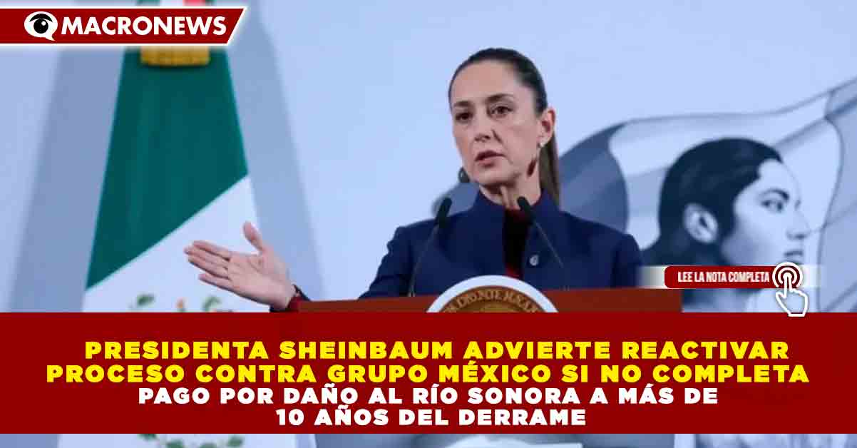 Redacción Macronews.- La presidenta de México, Claudia Sheinbaum Pardo, advirtió que el Gobierno federal podría reactivar el proceso legal contra Grupo México si la empresa no completa el pago y las acciones pendientes de reparación por los daños ocasionados al Río Sonora, a más de 10 años del derrame de sustancias tóxicas que afectó a comunidades de la región.