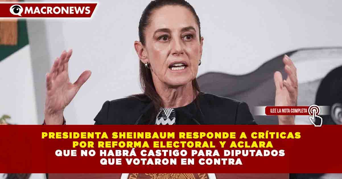 Redacción Macronews.- La presidenta de México, Claudia Sheinbaum, respondió a los cuestionamientos surgidos tras la discusión de su propuesta de reforma electoral y aclaró que no habrá castigo para los diputados que votaron en contra, destacando que el debate legislativo forma parte del ejercicio democrático en el país.