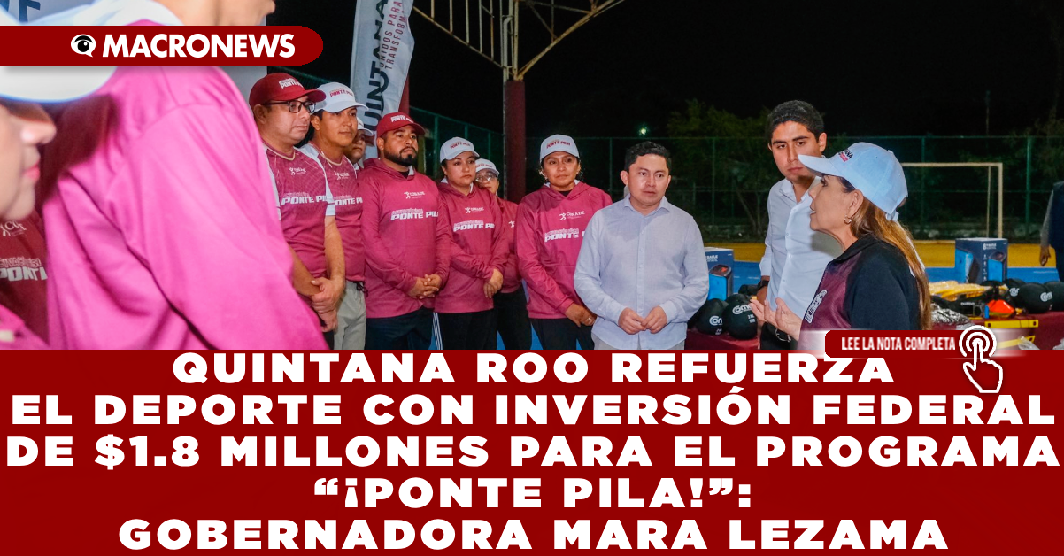 CANCÚN, Q. ROO. La gobernadora Mara Lezama Espinosa entregó material deportivo a las y los 23 embajadores del Programa Federal “¡Ponte Pila!” en Quintana Roo. Esta iniciativa, liderada a nivel nacional por la presidenta Claudia Sheinbaum Pardo y coordinada por la CONADE y su director Rommel Pacheco, tiene como objetivo fortalecer la Construcción de Paz y la Transformación del Deporte en el estado.